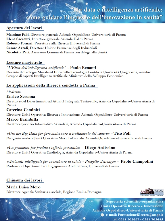 Moderano: Enrico Sesenna, Direttore del Dipartimento ad Attività Integrata Testa-collo, Caterina Caminiti, Direttore Unità Operativa Ricerca e Innovazione e Marco Brambilla, Direttore del Servizio Informativo Aziendale, Azienda Ospedaliero-Universitaria di Parma. Chiuderà i lavori congressuali il Direttore dell’Agenzia Sanitaria e sociale regionale Maria Luisa Moro.